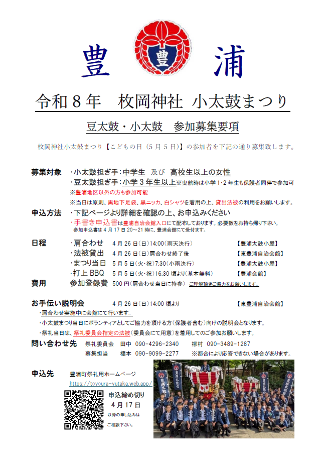 令和8年 小太鼓祭りの参加申込みを開始します。